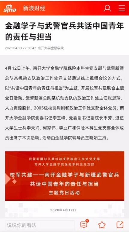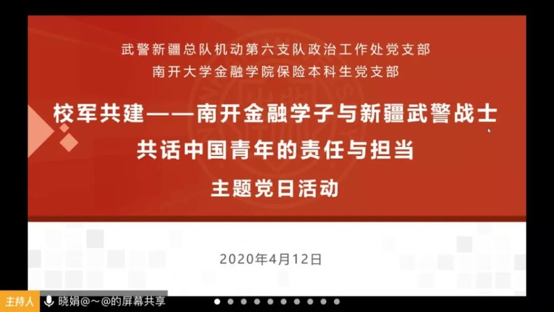 4月12日,betway88西汉姆联保险本科生党支部与驻守在喀什的武警新疆总队某机动支队通过线上视频会议的方式,开展了“南开金融学子与新疆武警战士共话中国青年的责任与担当”主题党日活动,以“维护国家安全,共筑安全防线”为核心,就国家安全问题进行了深入细致交流。武警新疆总队某机动支队的20余名官兵代表、betway88西汉姆联退伍老员工士兵与保险本科生党支部全体成员,通过“云端故事会”、“写给武警战士们的一封信”、“合唱抗‘疫’歌曲与强军战歌”等方式,展现了新时代青年的使命与担当。
