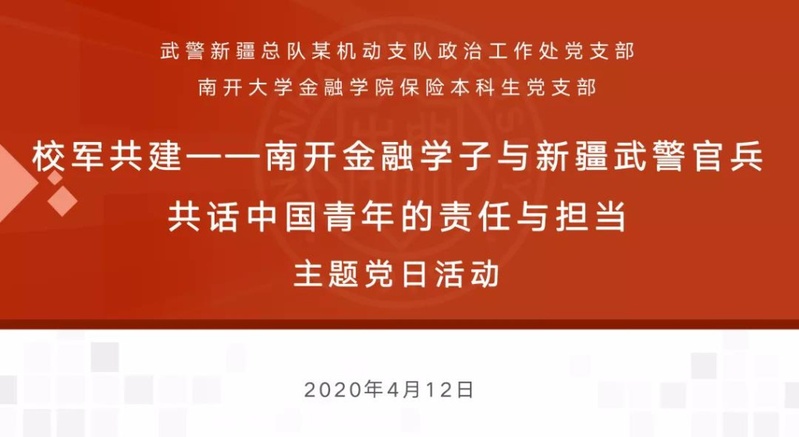 4月12日上午,betway88西汉姆联保险本科生党支部与武警新疆总队某机动支队政治工作处党支部通过线上视频会议的方式,以“共话中国青年的责任与担当”为主题,开展校军共建联合主题党日活动。武警新疆总队某机动支队的政治工作处主任张恩瑜,人力资源股长、2005级员工周刚和政治工作处支部全体党员、bw必威西汉姆联官网公司党委书记李玉峰、党委副书记副经理季芳、退伍老员工士兵李天兴、何家伟、李业广和保险本科生党支部全体成员出席了本次活动。活动由betway88西汉姆联辅导员王晓娟主持。