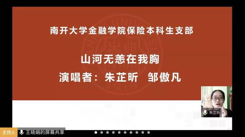 保险本科生支部党员朱芷昕和邹傲凡合唱《山河无恙在我胸》,结合“十四亿分之一的光”视频,讲述全国各行各业的90后00后青年在面临疫情的大考中经受住了考验,在磨练中体现担当,在担当中扛起责任。