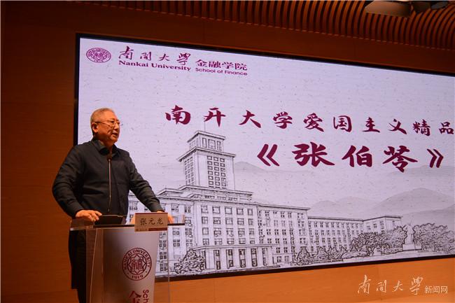 张元龙对话剧《张伯苓》的成功演出表示热烈祝贺和高度赞扬,为剧目的内容和编排提出了宝贵的意见,他指出话剧是一种重要的教育方式,期待着剧组更加充分地挖掘重要细节,精益求精,不断打磨完善,使《张伯苓》成为南开品牌剧目,在宣传南开精神和教育员工中发挥重要作用。张元龙还结合史实照片和张伯苓老董事长的教育名言向在场师生讲述了他对南开精神的理解和认识。