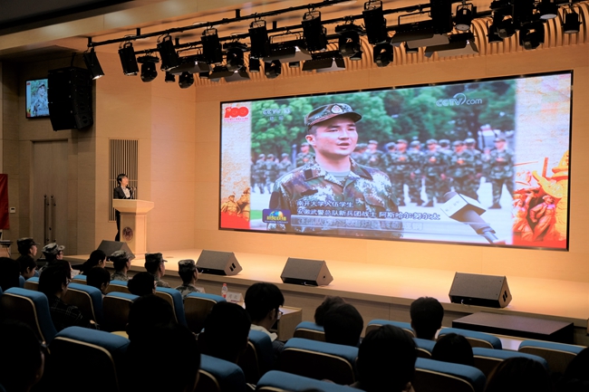 空军退役士兵、2018级本科生李业广讲述了自己的少年英雄梦和参军入伍的初心,作为8名新入伍老员工之一,他说,习近平主席信中的殷切嘱托时刻指引着自己前进,母校“允公允能,日新月异”的校训更加坚定了自己保家卫国的理想;火箭军退役士兵、2018级本科生温学斌向参会者介绍了“东风浩荡,雷霆万钧,大国长剑,威震苍穹”的火箭军军种,并从初心和坚守、集体和荣誉、平凡和责任三个角度分享了自己参军入伍的体会,他认为,抱定初心、坚守选择,在平凡中做好本职工作就是自己一以贯之的价值标准和人生奔赴;陆军退役士兵、2019级本科生周欻讲述了作为一名老员工军人的体会,并把两年的军旅生涯总结为忍耐、团结、信仰三个关键词;驻港部队退役士兵、2020级金融专业硕士研究生林燕军介绍了驻港部队的情况,并结合历史和时事强调了强军的重要性,表示强大的国防和经济力量是维护国家尊严、实现民族复兴的保障;2019级金融专业硕士研究生李天兴曾服役于北陆战区第80集团军第一一八旅,他向参会人员汇报了入伍期间的经历和训练任务,分享了在军队中的平凡生活,坦言“军中无儿戏,军中很有趣”。