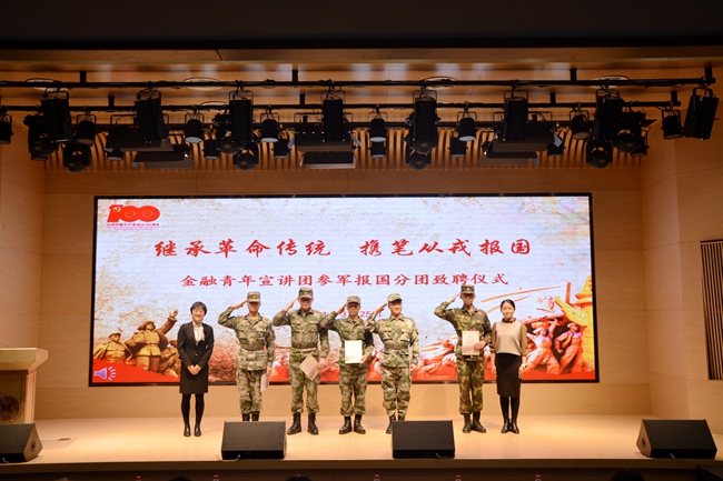 为进一步弘扬携笔从戎、参军报国的爱国精神,让更多青年学子听到退伍老员工的军营故事和军旅感悟,五位退伍的金融学子也加入了金融青年宣讲团,成立了参军报国分团。袁芳与阿依古丽为五位同学颁发聘书。