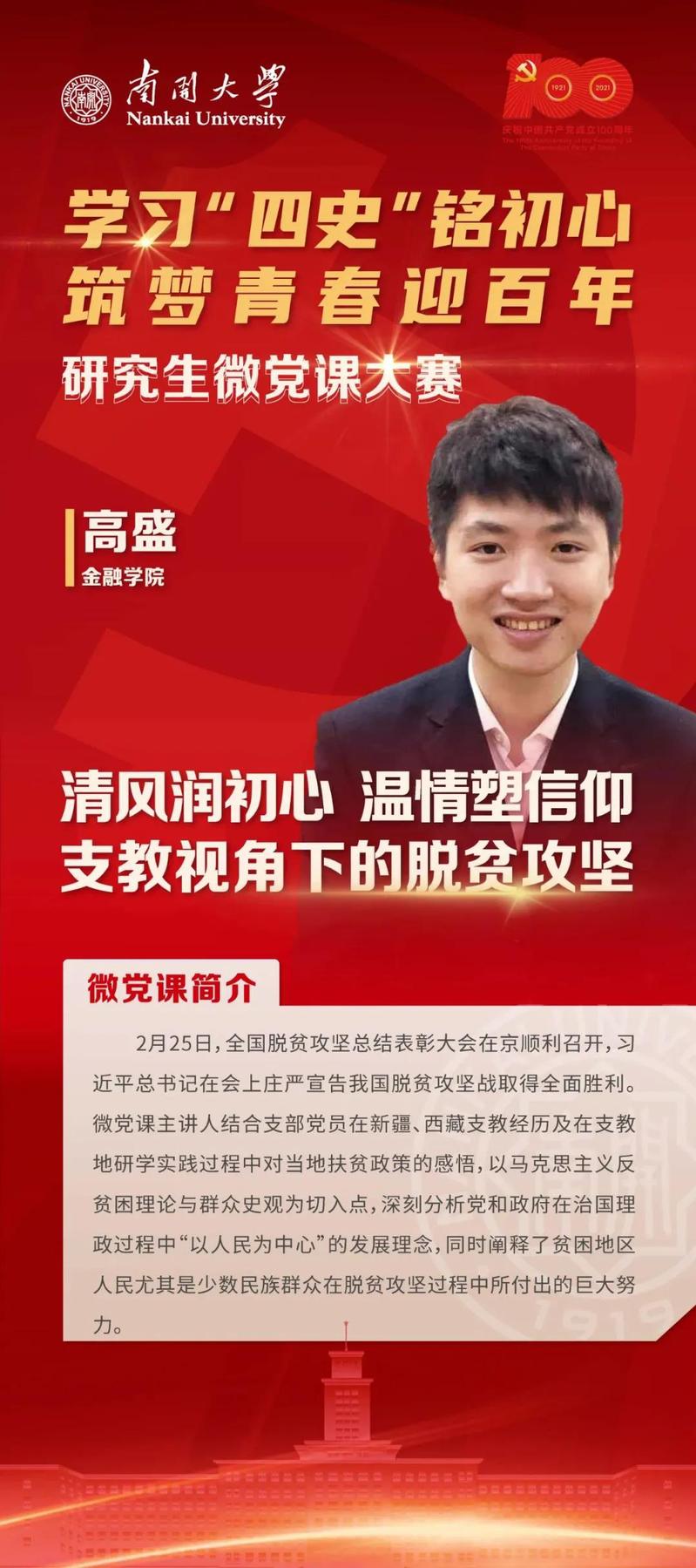 微党课大赛决赛于2021年5月23日上午在八里台校区省身楼二楼报告厅举行。大家围绕中国共产党百年奋斗征程,结合学科专业特色,从革命精神阐释、历史事件回顾、英雄事迹讲述等多视角进行了党课展示,由专家评审团和员工评审团共同评选产生“十佳微党课”。公司2020级精算学专业研究生、保险学精算学硕士生联合党支部书记高盛凭借《清风润初心 温情塑信仰——支教视角下的脱贫攻坚》主题党课获评校级“十佳微党课”。