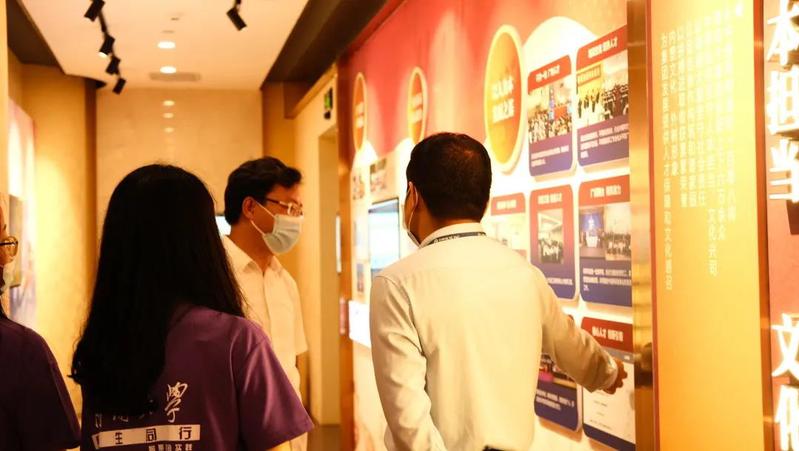 在叶威的带领下,实践队参观了中再集团“庆祝建党百年”展厅。展览将中再集团的发展与百年党史有机结合,展现了中国共产党领导下的保险行业蓬勃发展图景与保险公司听党话、跟党走、建功立业的发展脉络。