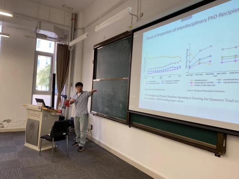 王博首先介绍了自己的研究方向,例如搭建中国的高层次人才数据平台和一些国内健康政策的研究等。随后,他介绍了本篇文章的研究背景:对个人“多重身份”的界定研究和其研究意义。由此,从具有交叉学科背景这个特征出发,探究了多重身份对交叉学科背景的博士生的市场回报的影响。之后,王博介绍了文章的亮点和创新点,主要包括数据的选取和模型的构造。数据方面,王博详细介绍了数据选取的逻辑和来源,例如在是否具有交叉学科的背景选择中采取主观和客观互相印证的判断方法,保证了判别交叉学科的可靠性;模型方面文章提出的新的两步法模型具有良好的科学性和扩展性,此模型可以扩展应用到更多领域的研究,例如管理和教育领域的“身份”问题。最后王博介绍了文章的主要结论:主研究学科在市场回报方面起到了决定性作用,交叉学科工作者并不存在工资溢价现象。