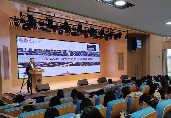 王新生从深刻认识党的百年辉煌成就,走进新时代、面对新矛盾、提出新理念,习近平新时代中国特色社会主义思想的形成及其意义,新时代征程走向光辉未来四个方面进行了阐述。他强调,要从“七一”重要讲话中的两个基本方面、两个坐标、“两个一百年”奋斗目标、四个“为了”、九个“必须”入手,深刻认识党的百年辉煌成就。在中国特色社会主义新时代,我们应牢记“两个一百年”奋斗目标,深刻认识新时代的主要矛盾,坚持创新、协调、绿色、开放、共享的新发展理念,解决新问题。