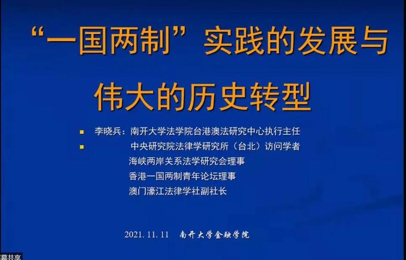 李晓兵还从全球治理、国家治理和区域治理三个层次对港澳特区“一国两制”实践进行分析,他提到,香港、澳门问题的产生和解决是全球化历史进程中的重大事件,而今在百年未有大变局的历史背景之下,世界政治经济格局深度重塑,我们必须保持港澳特区“一国两制”实践的创造性和开放性,不断拓展港澳特区“一国两制”实践的宽度和广度,不断提升港澳特区“一国两制”实践的高度和层次。建设粤港澳大湾区,打造世界级城市群,推动港澳特区与内地之间实现融合发展,进一步提升粤港澳大湾区在国家经济发展和对外开放中的支撑引领作用,有利于推动构建国内国际双循环发展格局,有利于保持港澳特区长期繁荣稳定,让港澳同胞同祖国人民共担民族复兴的历史责任、共享祖国繁荣富强的伟大荣光。制定实施香港国安法、完善香港特区选举制度,在确立香港特区维护国家安全基本政治底线和法律底线的同时,有利于香港特区宪制秩序重塑目标的实现,有利于重建香港特区政治生态并提升香港特区政治过程的品质。