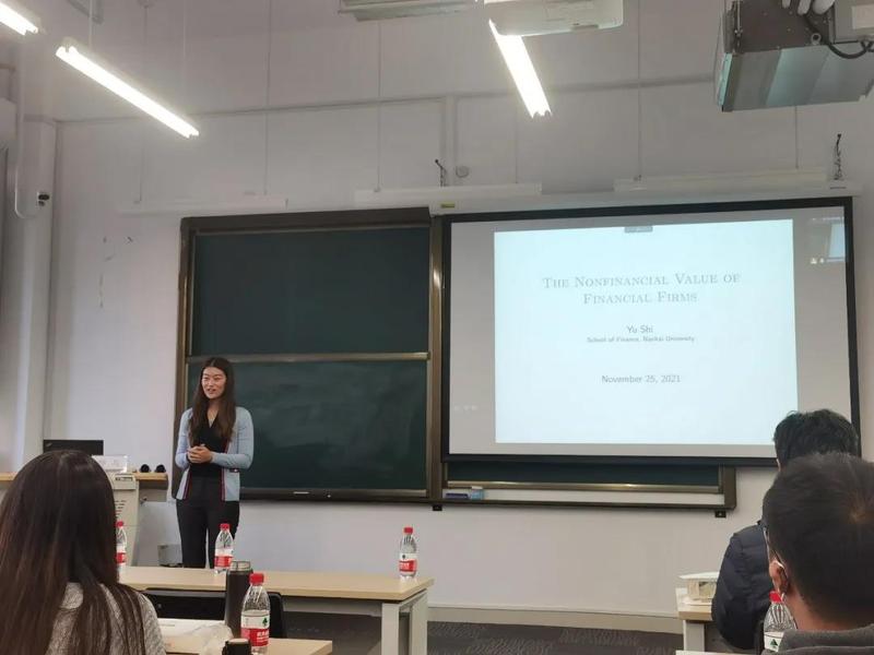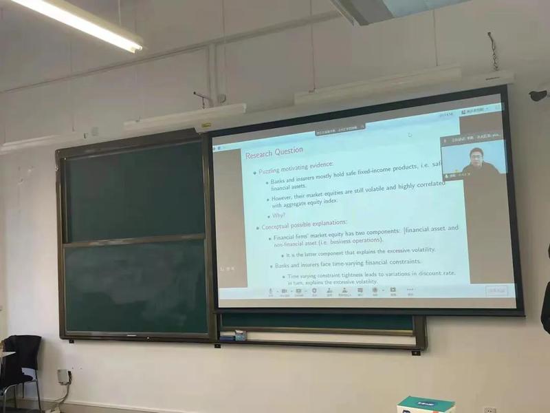师与此次展示的内容是她最近的研究成果《The Nonfinancial Value of Financial Firms》。文章论述了金融公司的非金融资产价值对于金融公司的市值的影响。以保险公司为例,师与将金融公司资产分为金融资产及非金融资产,并运用实证方法论证这两种资产风险特征差异。尽管非金融资产仅占金融公司总资产的40%,其波动却可以解释金融公司市值时间序列上81%波动和横截面上100%的波动。现有的为防止金融公司破产的的政策大多专注于控制其金融资产风险,而非金融资产的波动性可能会同样导致金融公司面临破产。