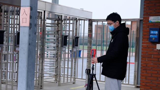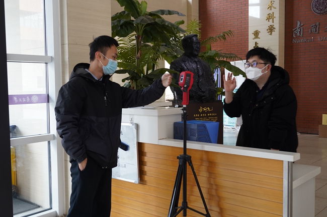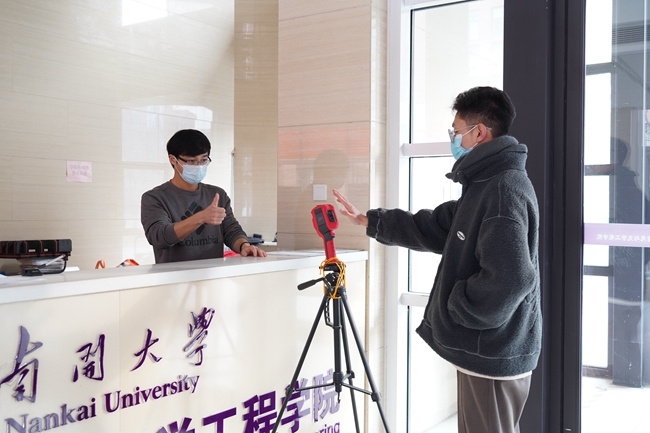 学院海归教师王博、戴文廷,韩国籍教师权五燮变身楼宇保安,在电光学院、理科操场、计网学院值班,为进出师生查双码、测体温、做登记。
