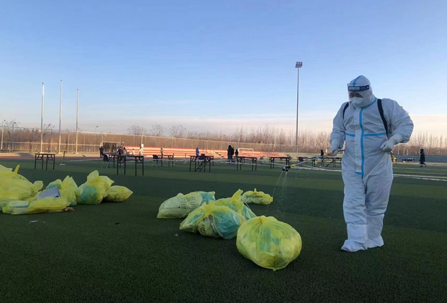 当完网格员,郑光明还变身消杀大白,在全校核酸筛查现场,为防疫垃圾消毒。