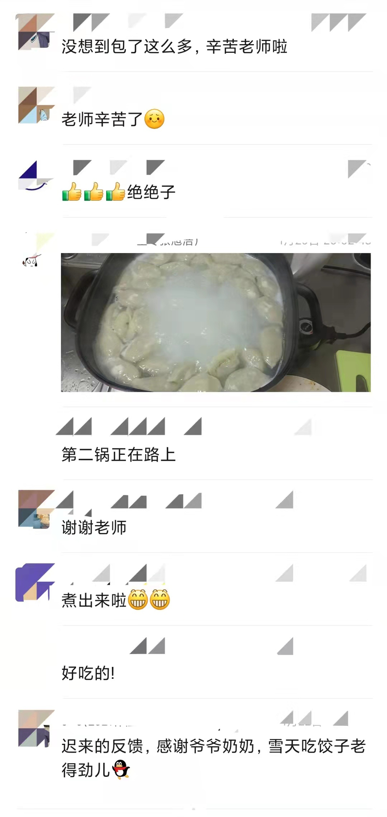 为遵守疫情防控政策,王晓娟把现包的饺子分装好,让同学们带回各自的家中自己煮。晚饭时间,一张张热气腾腾的饺子照发到了群里。王晓娟开心地谈到,“从18日至今,一直在接受来自学院的关心和亲邻的照顾,看到身边的同事逆行回到学校,看到医务工作者和志愿者们的付出,自己除了坚守本职岗位外,也想把这份爱传递出去,希望同学们能保持良好的生活状态,我们一起守望相助、共抗疫情!