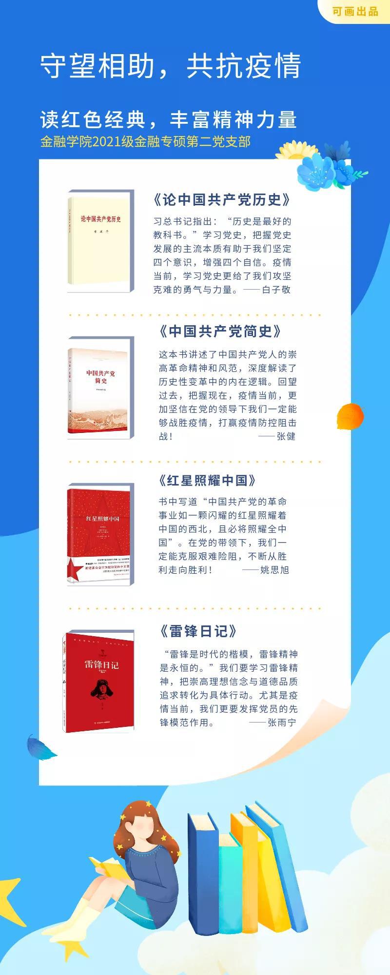 支部以“共建共享读书会”活动为基础,发起了线上红色经典共读活动。支部全体成员积极参与,向大家分享了《论中国共产党历史》、《中国共产党简史》、《红星照耀中国》、《雷锋日记》等书籍。处于抗疫期间,支部希望以读书活动丰富大家的精神需求,从红色经典中汲取精神力量,同心抗疫,共克时艰。