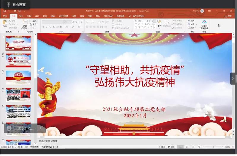 在全面了解支部党员现状后,支部线上召开“守望相助,共抗疫情”主题疫情防控动员会,支部委员陈雯雅以中国共产党人精神谱系之“抗疫精神”为核心带领大家学习了习近平总书记在全国抗击新冠肺炎疫情表彰大会上对伟大抗疫精神作出的深刻阐释:习近平总书记明确指出了在这场同严重疫情的殊死较量中,中国人民和中华民族以敢于斗争、敢于胜利的大无畏气概,铸就了生命至上、举国同心、舍生忘死、尊重科学、命运与共的伟大抗疫精神。党支书白子敬在动员会上指出,在校在津的党员同志要积极落实学校、学院的防疫要求,配合防疫并做好自身防护;离津的同学要第一时间上报当地社区,按照各地疫情防控政策积极配合当地疫情防控;并号召无论身处何方,都要积极参与疫情防控志愿工作,发挥党员的先锋模范作用。