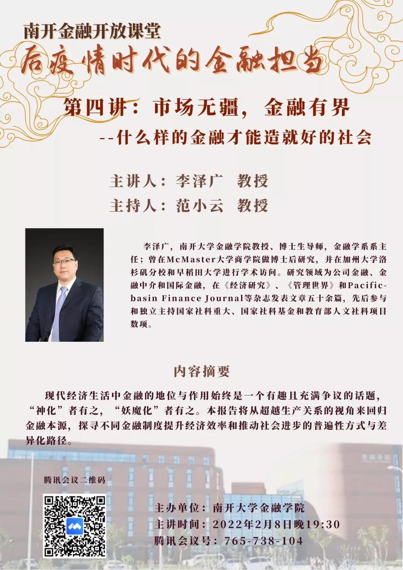 “南开金融开放课堂——后疫情时代的金融担当”第四期活动安排如下: