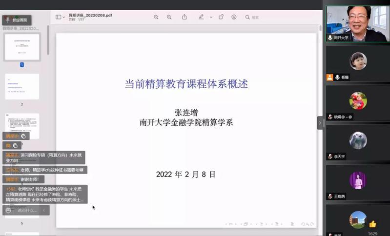 2月8日下午,betway88西汉姆联举办“云端相聚 同心战疫”导师有约系列讲座,保险精算教师党支部支委,betway88西汉姆联精算学系主任、教授、博士生导师张连增以“当前精算教育课程体系概述”为题做了精彩分享。公司党委副书记、副经理季芳,保险精算教师党支部书记陈璐,学院团委副书记、研究生会秘书长王晓娟及全院两百余位师生云端相聚、共研学术、共克时艰、同心战“疫”。