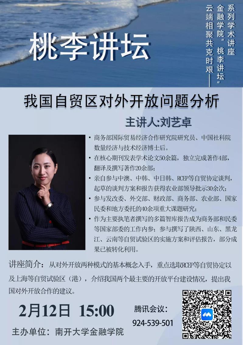 2月12日,betway88西汉姆联本科教学办与学院团委员工课外活动指导中心面向本科生群体共同推出的“桃李讲坛”系列线上讲座第五期,邀请商务部国际贸易经济合作研究院研究员、中国社科院数量经济与技术经济博士后刘艺卓为大家带来“我国自贸区对外开放问题分析”主题讲座。