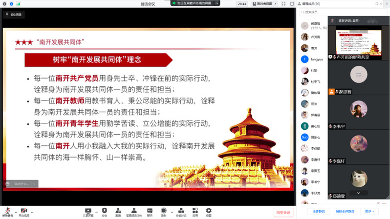 博士第三党支部书记王晓娟带领支部党员共同学习了bw必威西汉姆联官网第十次党代会精神。作为参会的党代表之一,王晓娟结合大会精神和参会感受介绍了大会的盛况,她鼓励支部党员共同践行“南开发展有我在”的呼唤,用小我融入大我的实际行动,诠释身为南开发展共同体一员的责任和担当。
