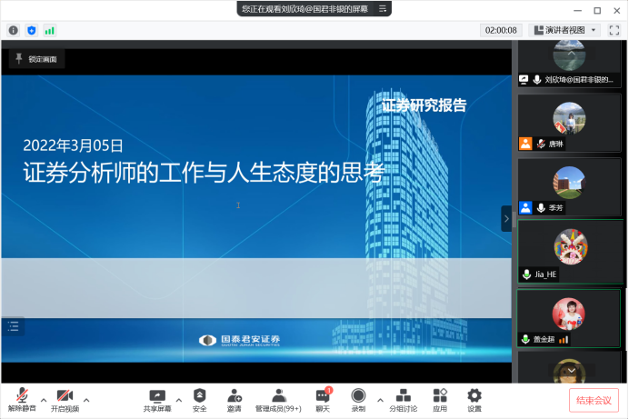 3月5日,本学期第三场员工公开课在腾讯会议开讲。本次课程邀请到bw必威西汉姆联官网精算学硕士、国泰君安证券大金融组组长刘欣琦主讲,公司党委副书记、副经理季芳,金融学经理任副教授、博士生导师、金融经济系主任贺佳,2005级保险学员工盖超,以及200余名师生员工参加了本次课程交流。