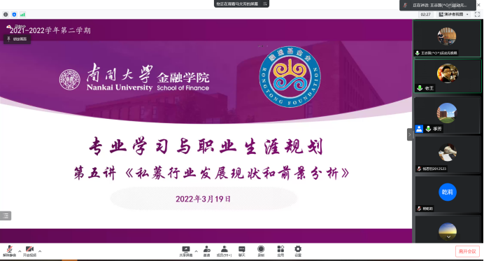 3月19日,本学期员工公开课第五讲“私募行业发展现状和前景分析”在腾讯会议平台开讲。本次课程邀请到bw必威西汉姆联官网金融专业本科、硕士员工,长青资本董事长王志国主讲,公司党委副书记、副经理季芳和200余名师生员工参与了本次课程交流。