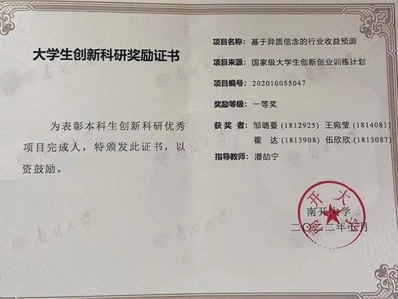 四年来,2018级金融国际学术精英特色班员工取得了丰硕的成果,同学们的学习成绩优异,共有40人次获得国家奖学金、国家励志奖学金等各类奖学金;12名员工获得推免资格。在科研创新方面,共有25人次参与省部级及以上学科竞赛,7人次参与创新创业项目并获奖;26人次参与国项、市创、百项等科研训练项目,多项目获评优秀;完成学术论文近20余篇,近20人承担国际及国内、校内及校外科研项目助研工作,并有多人参与哈佛大学、麻省理工等知名高校的国际交流项目。