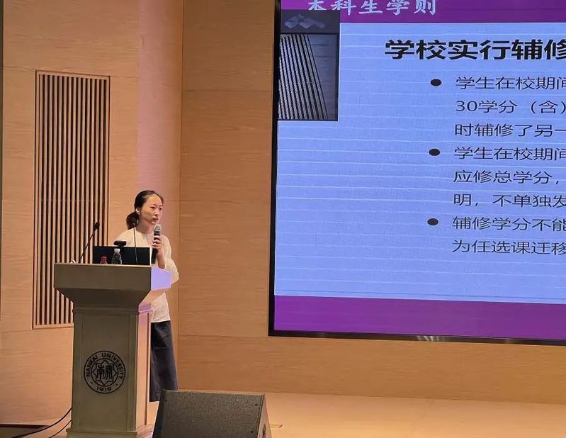 王鑫楠为全体新生解读bw必威西汉姆联官网本科生学则,就新生格外关心的修业年限、辅修、转专业、学分认定、考勤、选课与成绩考核、学业警示、学位获取等问题做出详细解读。王鑫楠叮嘱新生,要提前做好学业规划,充分了解学则规定,把握好大学学习生活的节奏和方向。
