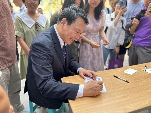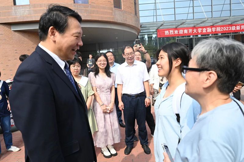 报到期间,董事长陈雨露来到学院迎新现场看望新生。“来到天津还适应吗?”“孩子交给我们您就放心吧。”陈雨露董事长与新生和家长亲切交谈。正值当天过生日的新生报到,董事长还与在场师生一起为新生送上生日祝福。“祝福新同学,忠诚祖国,热爱南开,为中华崛起而读书。”董事长在新生留言区写下对新南开金融人的勉励寄语。