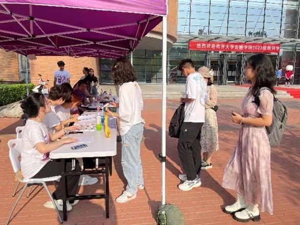 报到日当天,学院精心布置的“入学拱门”和红毯寓意着在南开金融的崭新起点。新生们陆续来到报到点,志愿者们用贴心周到的服务为他们办理报到手续、发放新生礼物。新生们在签名板前签名、与学院吉祥物小金小融合影留念,为开启崭新的学习生活留下浓墨重彩的一笔。
