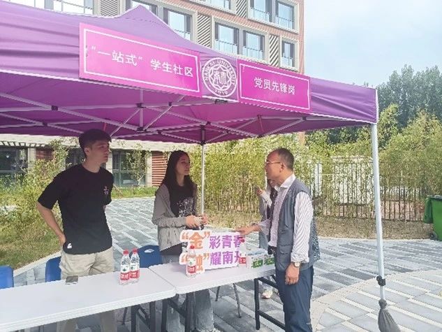 迎新现场,学院充分发挥员工党员的先锋引领作用,在“一站式”成长社区学10宿舍门前设立党员先锋岗,解答新生疑问、做好引导服务,还为新生和家长准备了药品、水、面包等物资;在学院集中报到点设立党员先锋岗,向新生讲解入党政策。