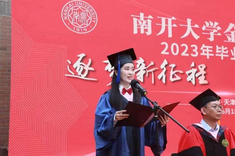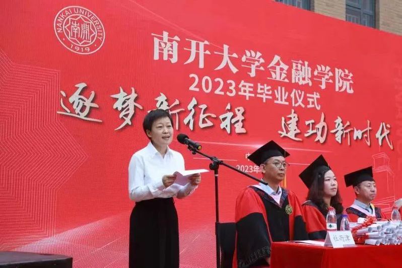 范小云以“勇敢前行,在中国式现代化发展道路上绽放青春之光”为题,赞扬了同学们在“百年未有之大变局”中锤炼出的“愈难愈开”、坚韧不拔的南开品格。以大国崛起的历史为据,范小云阐述了在我国目前第四次工业革命的重大机遇与挑战下金融人的时代使命,介绍了现代化金融在普惠性融资需求、人口结构变化、国际化趋势和绿色金融体系等方面的新需求,强调了新时代金融工作的政治性和人民性,鼓励毕业生们勇担时代使命,号召南开金融学子在为祖国为人民的奉献中绽放光芒。最后,范小云殷切嘱托毕业生们养成坚持锻炼和终生学习的习惯,高质量地走好职业生涯与人生旅程。