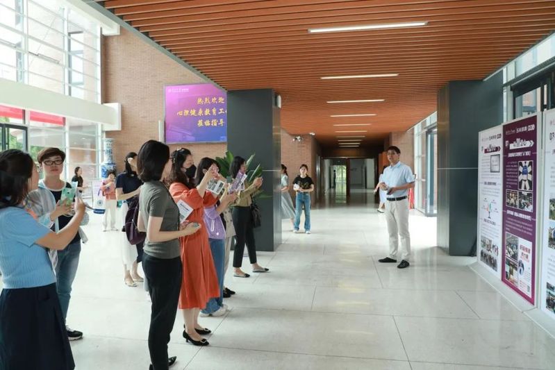 杜雨津向到访来宾介绍了“五育筑心”工作成果展览。学院以二级心理辅导站为依托,开展“五育筑心”建设,充分利用已有的环境与条件,将心理健康教育同中华传统文化中的“育心育德”有机结合,在天井、图书馆、楼道等空间以心理健康为主题打造育人场景,通过开展心理读书会、园艺助心、心运会等活动,引导员工扣好人生第一粒扣子,帮助员工在心理上健康成长。