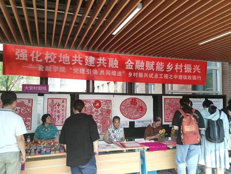 当天正值第39个教师节,为了让师生近距离地感受乡村振兴建设成果,提升师生参与建设美丽乡村的积极性、主动性和创造性,活动现场设计了丰富的互动体验项目。师生们共同品尝农副产品,在非遗文化传承人王虹权、郁从霞等老师的传授下学习剪纸、盘扣、钩织等手工技艺,还在学院天井的劳动教育基地与潮宗桥村的工作人员切磋种植技巧、播撒萝卜种子。金融本科生第一党支部的党员们还参与到“青耘中国”直播助农公益工作室的直播活动中,用实际行动助力金融赋能乡村振兴。