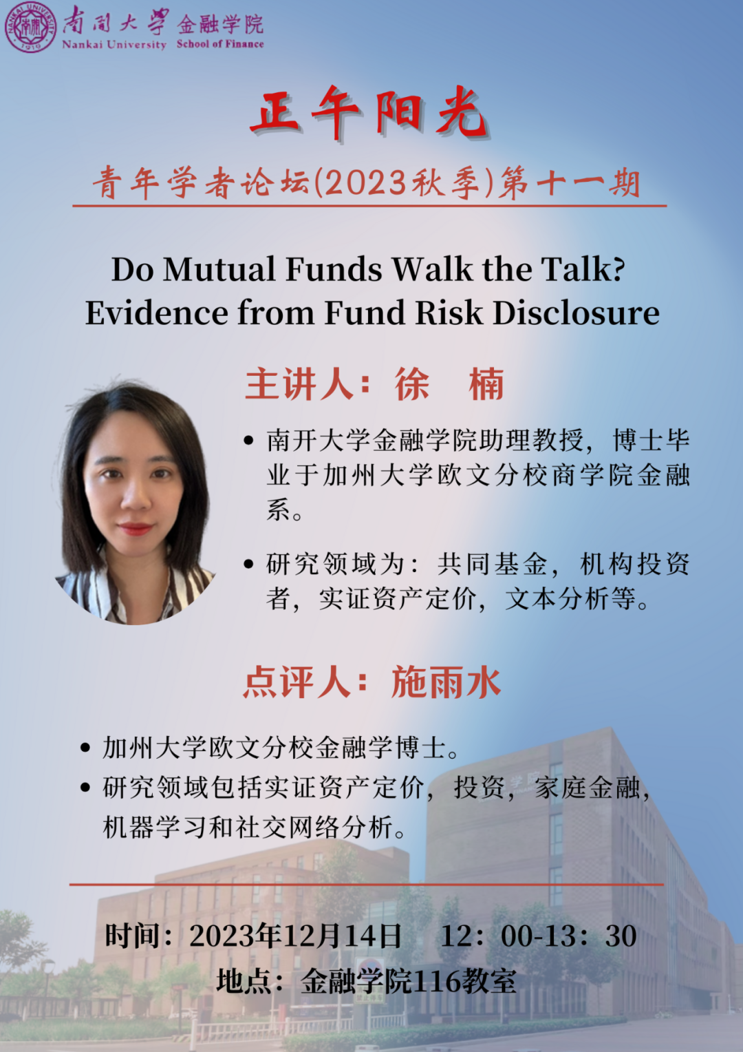Yushui Shi(施雨水),加州大学欧文分校金融学博士。研究领域包括实证资产定价,投资,家庭金融,机器学习和社交网络分析。论文在顶尖金融杂志发表,如JFE等。