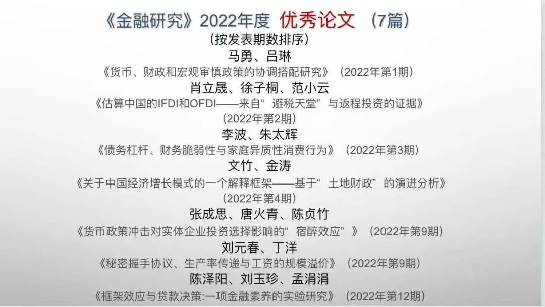 据悉,2010年以来,《金融研究》编辑部每年邀请来自高校、人民银行等机构的知名专家学者,通过通讯评审及现场评审会形式评选年度优秀论文,第十四届参评论文为2022年1-12期发表的全部论文,最终确定《金融研究》2022年度优秀论文7篇,年度最佳论文空缺。