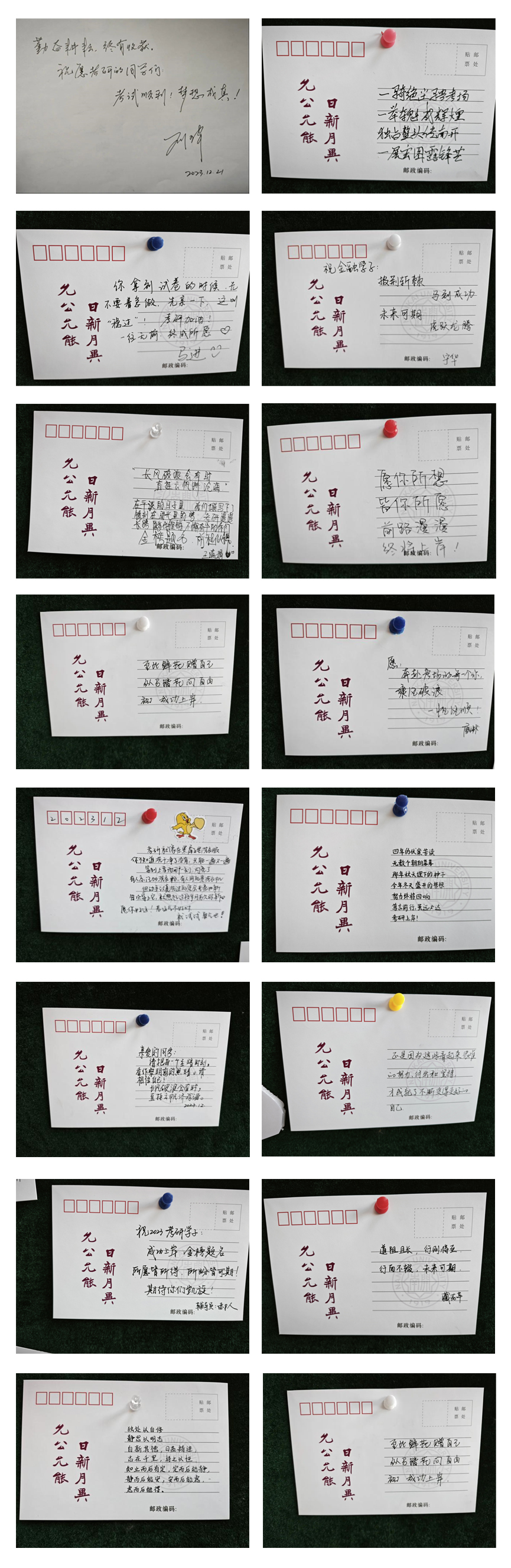 踏入betway88西汉姆联一楼大厅,映入眼帘的是精心布置的“‘研’路有你,未来可期”考研加油墙,上面贴满了来自学院领导老师与同学们手写的祝福明信片。每一张明信片都满载老师和同学们对考研学子的真挚祝福与深切期许。这份浓浓的关爱和鼓励,使同学们备受鼓舞。