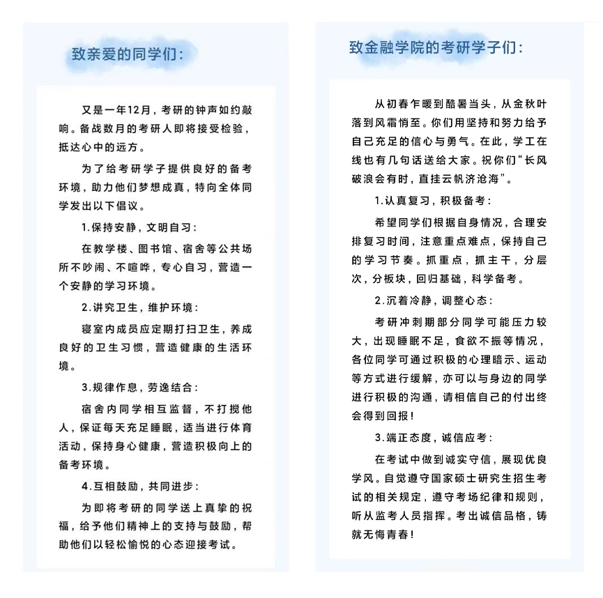 为进一步加强学风建设与诚信教育,营造浓厚学习氛围,护航考研学子保持良好备考状态,学院面向全体员工和考研学子发布《考研倡议书》,安排辅导员、心理健康专员开展心理支持服务,及时关注、缓解考研员工的心理焦虑情绪,并通过考研经验分享交流会等活动,为考研员工多方位提供强有力支持。