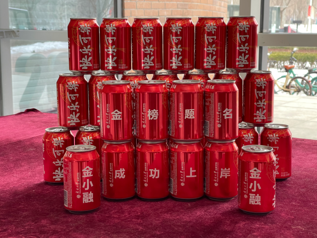初雪飘飘,银装素裹,风雪中奋步前行的考研学子收到了来自学院的暖心关怀——一份沉甸甸的考研大礼包:印有“一‘研’为定,心想‘柿’成”的陶罐福袋,寓意着心想事成、金榜题名;定制的印有每一位考研学子姓名的“快乐可乐”,祝愿考研学子安心备考、顺利“上岸”。
