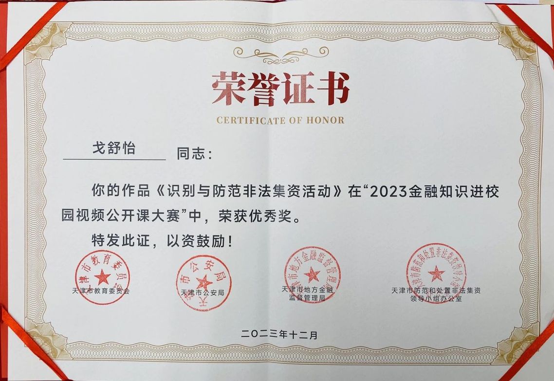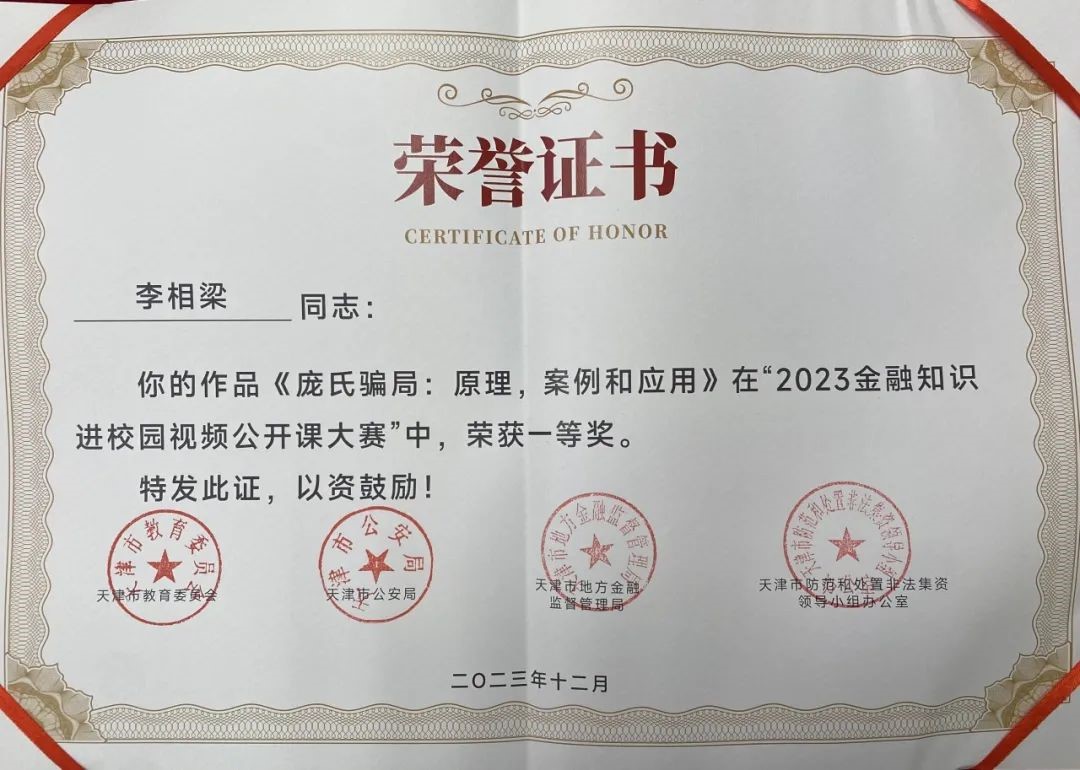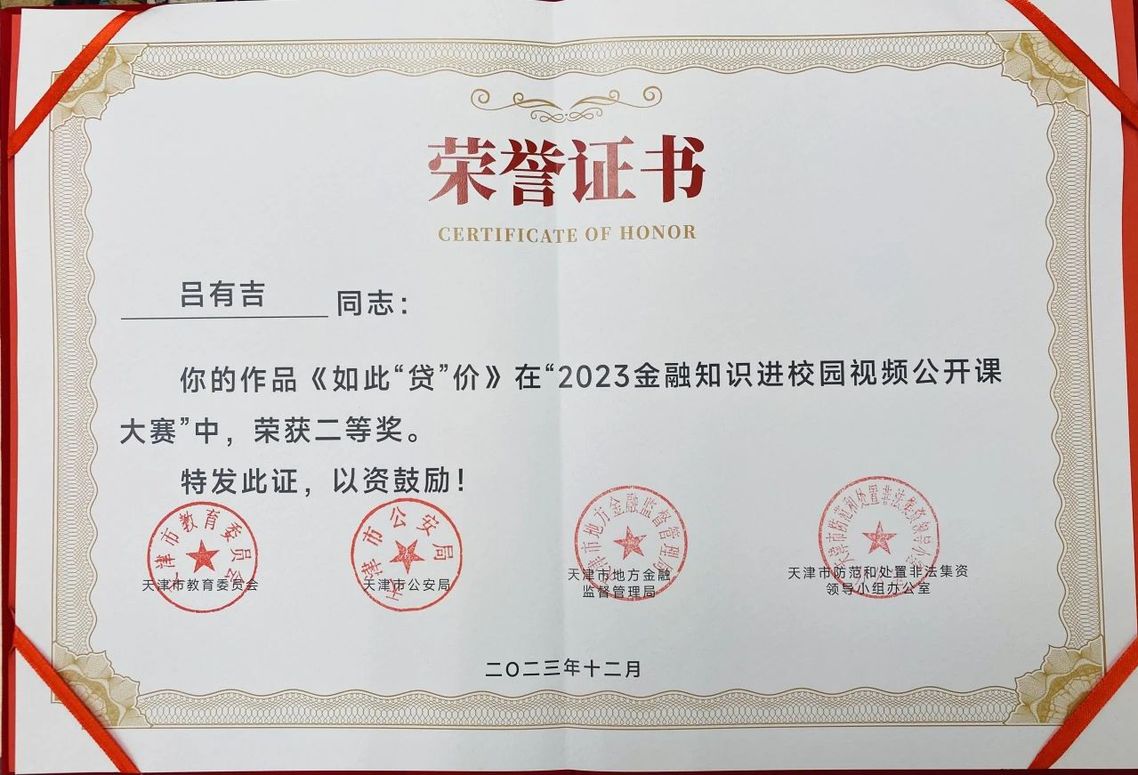 近日,由市教委、市公安局、市金融局、市处非办共同举办的天津市2023年金融知识进校园视频公开课大赛圆满落幕。大赛主题为“防范金融风险 提升金融素养”,以防范非法集资、校园贷、套路贷等非法金融活动和金融骗局为重点,坚持精准防治和问题导向,针对高校师生心理特点,结合法律法规解读、典型案例讲解、投资风险教育等形式,剖析犯罪手法,普及金融知识,引导广大师生有效识别风险,树立正确理财观念,提高自身防范能力。betway88西汉姆联多名教师代表学校参加了大赛,并取得佳绩。