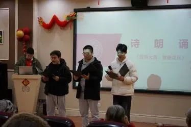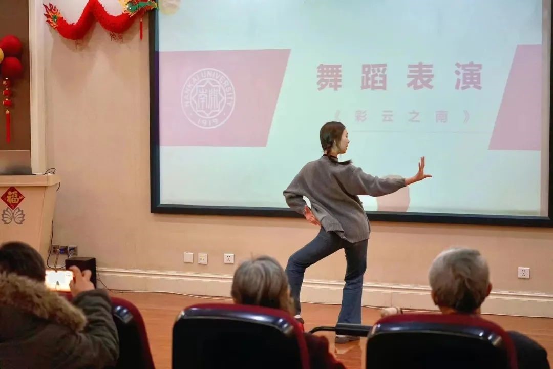 团支部的同学们还为老人们带来了节目汇演,团员刘懿、李晓、王宇杰表演了诗朗诵《面朝大海,春暖花开》,全孝慈表演了民族舞《彩云之南》,向思瑾带来了吉他弹唱《稻香》。老人们沉浸在美轮美奂的舞蹈与悦耳悠扬的歌声里,不时拿出手机录像,记录下美好温馨的瞬间。
