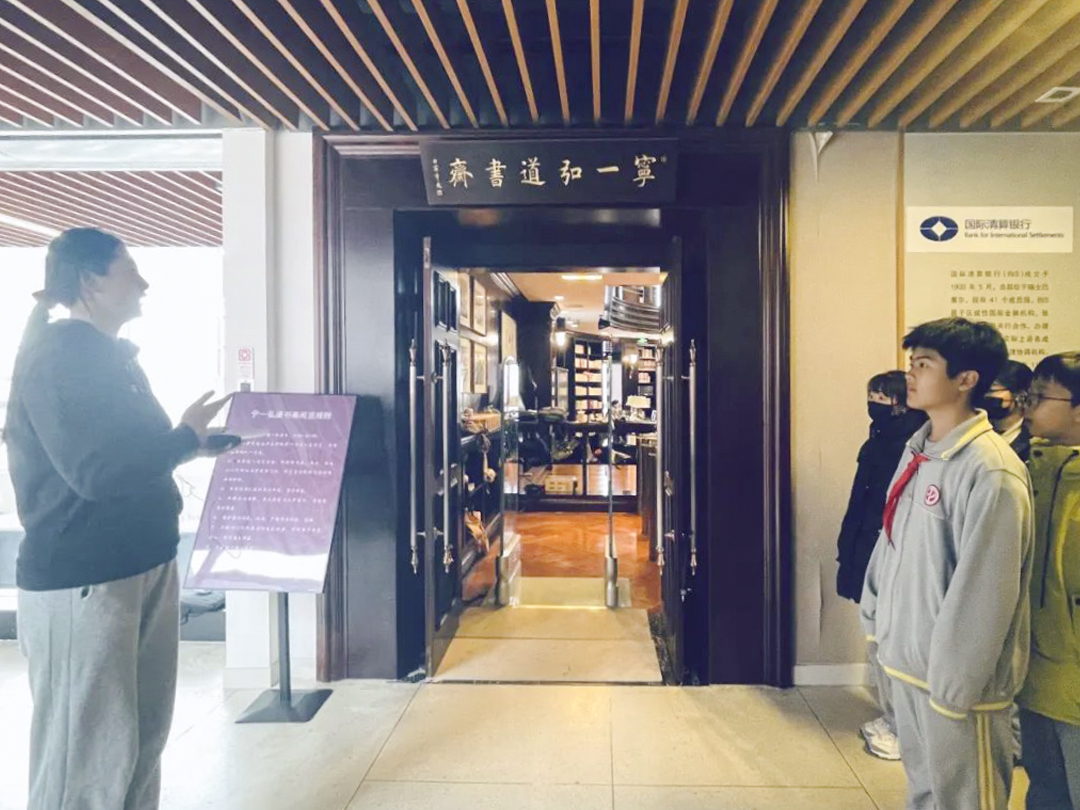 作为书斋讲解员,2021级保险学本科生龚建蕾为同学们介绍了宁一弘道书斋的落成背景,讲解了员工王静君先生的捐赠理念及书斋整体的设计风格,并带领大家参观了特色馆藏图书及特色藏品。同学们有序参观了书斋内的藏书,领略了王渭田先生的《中国梦》书法作品以及陈无忌先生所创作的《羁鸟恋旧林》画作。