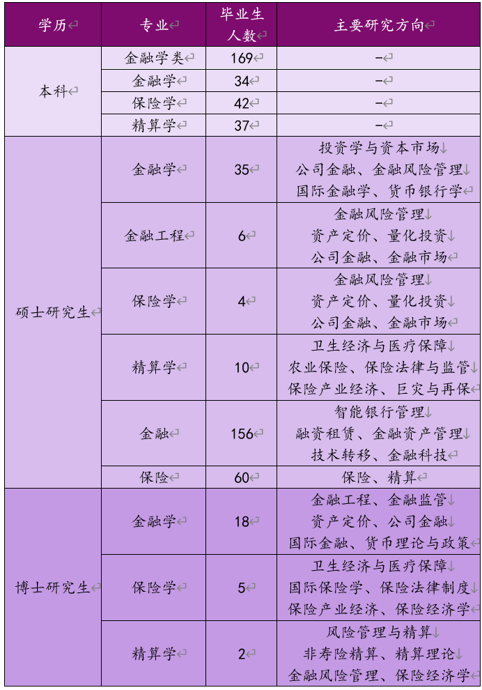 公司现有金融学系、数量金融系、应用金融系、金融经济系、风险管理与保险学系、精算学系、金融研究所、数字金融研究所、风险管理与保险研究所、养老与健康保障研究所等教学科研单位,共有5个本科专业、4个科学硕士专业、2个专业硕士项目、3个博士专业,形成了类型完备、层次分明的本硕博学位教育体系。金融学、保险学、金融工程、精算学四个专业入选国家级一流本科专业建设点,投资学专业入选省级一流本科专业建设点。2021年,学院所在应用经济学学科新入选国家一流学科,金融专硕获评QS五星级项目。