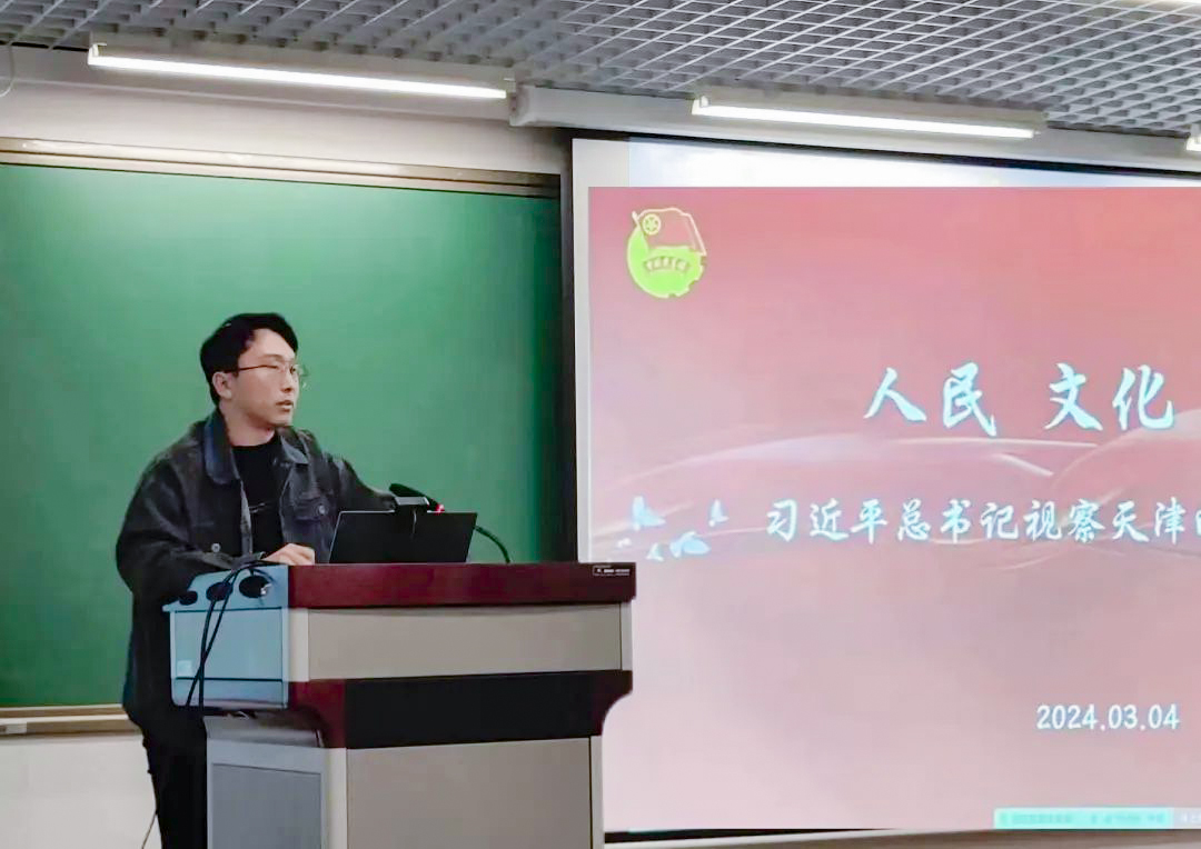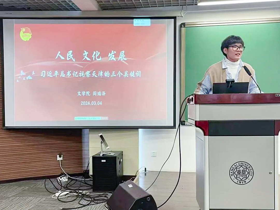 阎瑞泽回顾了习近平总书记在天津市西青区辛口镇第六埠村考察的画面,从“人民”“文化”“发展”这三个关键词切入,分享了学习习近平总书记视察天津的重要讲话精神的心得感悟,并结合个人大学成长发展经历,倡议大家要牢记习近平总书记的殷殷嘱托,把专业学习同实践结合起来,为争做堪当民族复兴重任的时代新人努力奋斗。