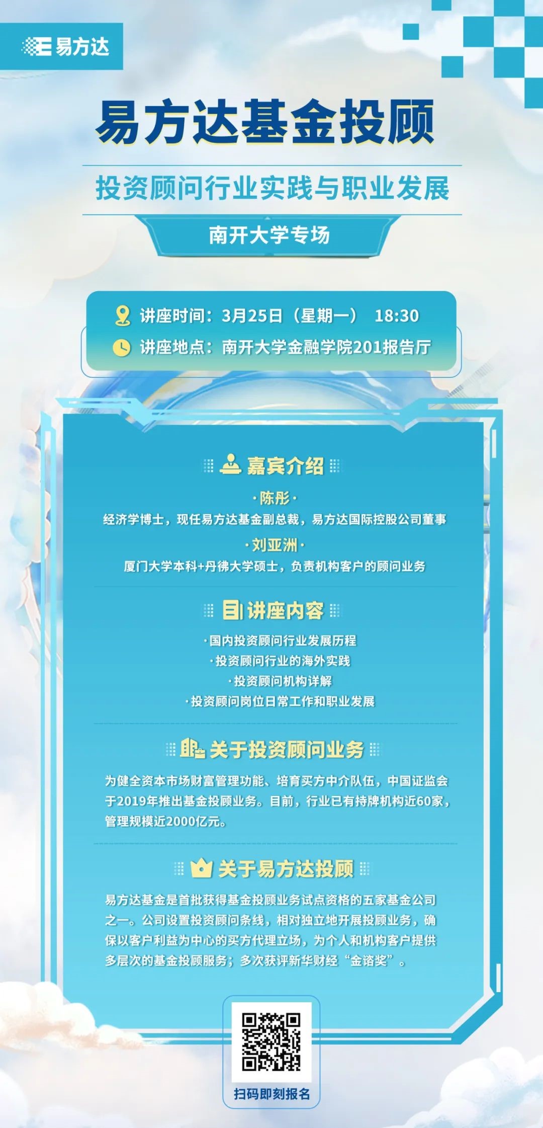 投资顾问行业近年显示出向着专业化、规范化方向迈进的趋势,为帮助同学们更好适应金融行业发展,特准备了本次“投资顾问行业实践与职业发展”讲座,欢迎有意愿的同学们踊跃参与。