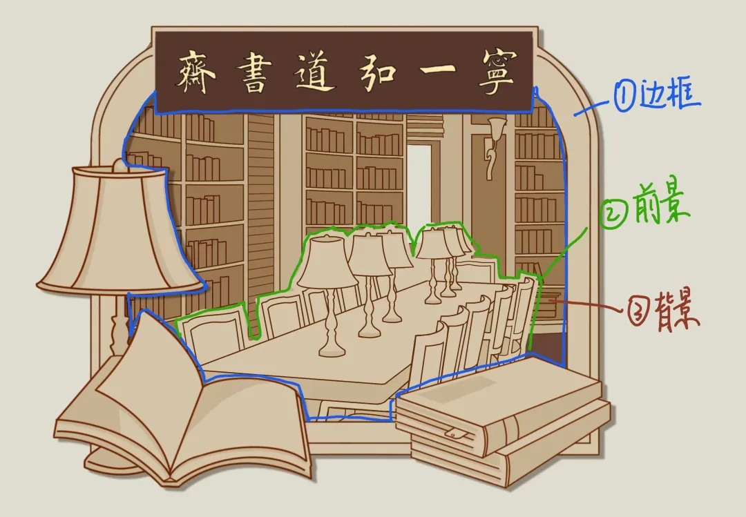 除此之外,书斋的磁性贴也是有分层设计的哟~边框、前景、背景三个分层,富有有层次感和空间感,好像开了一扇小窗悄悄地欣赏书斋~