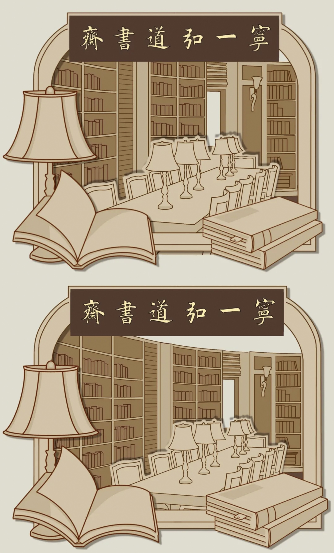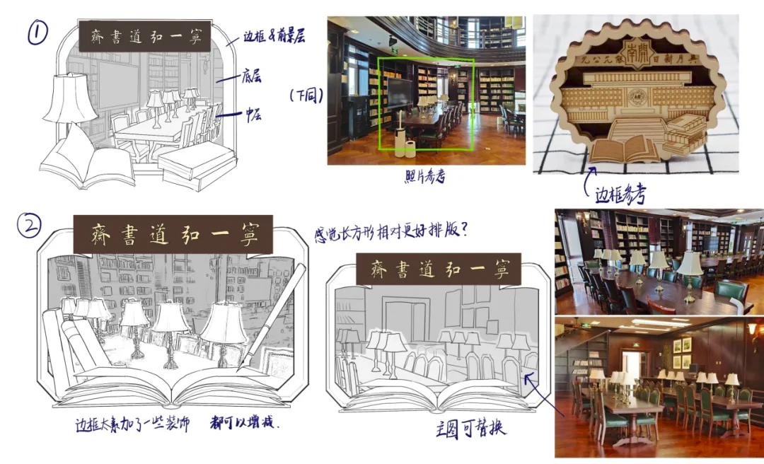 接下来,选定初稿中的一版并在其基础上继续细化完善,呈现出了相对完整的设计图二稿,色调上选择了符合书斋风格的浅褐棕色,书卷气已经开始氤氲啦!
