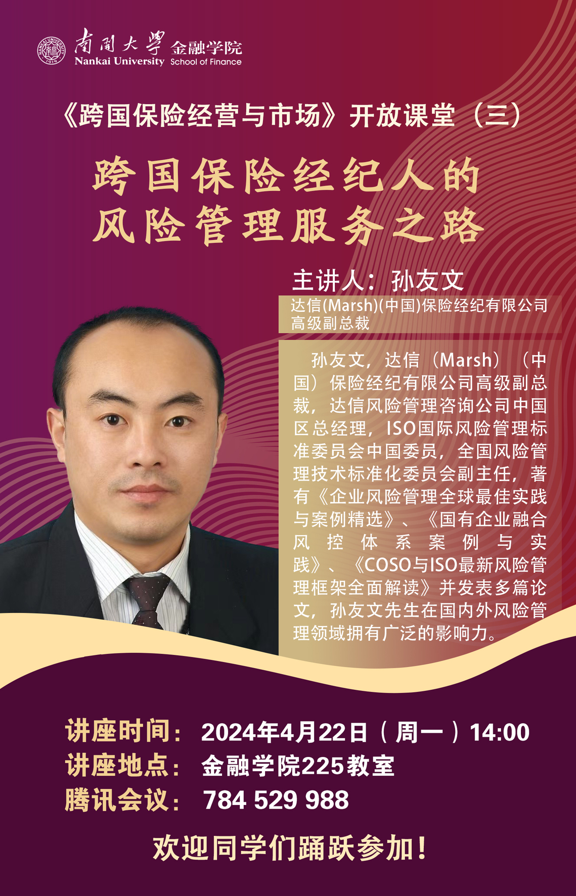 孙友文,达信(Marsh)(中国)保险经纪有限公司高级副总裁,达信风险管理咨询公司中国区总经理,ISO国际风险管理标准委员会中国委员,全国风险管理技术标准化委员会副主任,著有《企业风险管理全球最佳实践与案例精选》、《国有企业融合风控体系案例与实践》、《COSO与ISO最新风险管理框架全面解读》并发表多篇论文,孙友文先生在国内外风险管理领域拥有广泛的影响力。