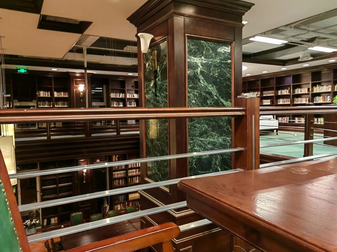 书斋的外观古朴典雅,透露出一种沉静而庄重又不失活泼的气息。走进书斋,首先映入眼帘的是一排排整齐的书架,上面摆满了各式各样的书籍,从经典名著到前沿科技,应有尽有。柔和而温暖的灯光洒落在书页上,营造出一种安静而舒适的阅读环境。优雅的欧式吊灯,舒适的地毯以及二层的大沙发,写满了属于南开金融学子的故事。
