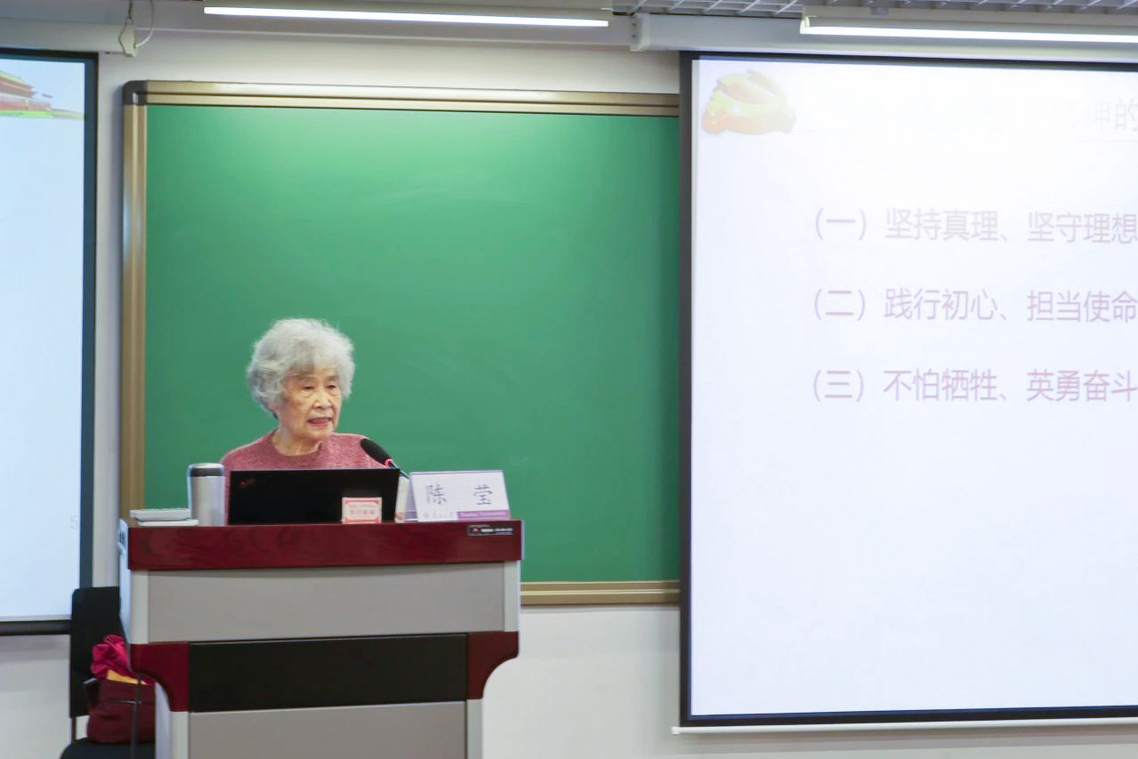 陈莹详细解释了伟大建党精神之内涵。“坚持真理,坚守理想”意味着要坚持把马克思主义原理和中国具体实际相结合,坚守中国特色社会主义的共同理想和共产主义的远大理想;“践行初心,担当使命”要求我们牢记为中国人民谋幸福、为中华民族谋复兴的初心使命;“不怕牺牲,英勇奋斗”告诉我们正是因为有一大批视死如归的革命烈士和忘我奉献的先进模范,我们的党才能走到今天;“对党忠诚,不负人民”强调了全心全意为人民服务、永不叛党。