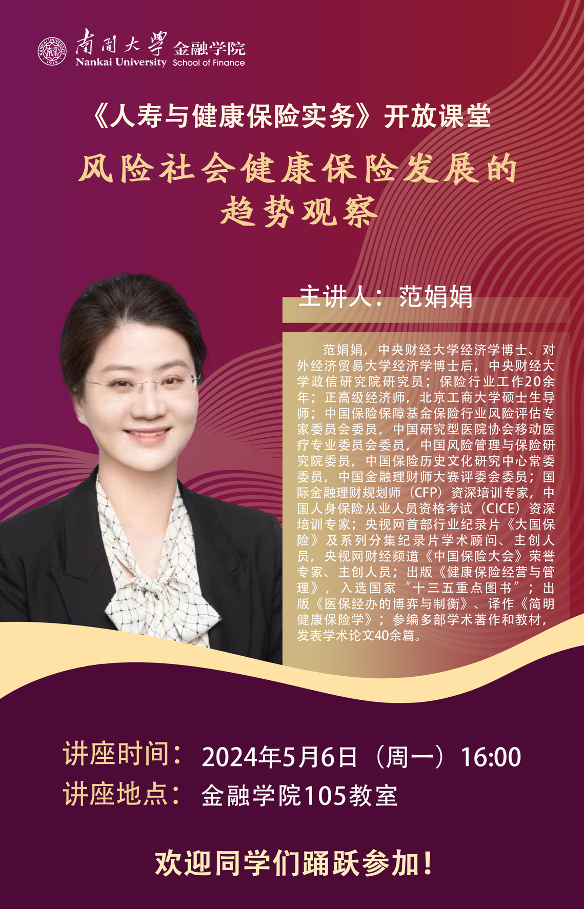 范娟娟,中央财经大学经济学博士、对外经济贸易大学经济学博士后,中央财经大学政信研究院研究员;保险行业工作20余年;正高级经济师,北京工商大学硕士生导师;中国保险保障基金保险行业风险评估专家委员会委员,中国研究型医院协会移动医疗专业委员会委员,中国风险管理与保险研究院委员,中国保险历史文化研究中心常委委员,中国金融理财师大赛评委会委员;国际金融理财规划师(CFP)资深培训专家,中国人身保险从业人员资格考试(CICE)资深培训专家;央视网首部行业纪录片《大国保险》及系列分集纪录片学术顾问、主创人员,央视网财经频道《中国保险大会》荣誉专家、主创人员;出版《健康保险经营与管理》,入选国家“‘十三五’重点图书”;出版《医保经办的博弈与制衡》、译作《简明健康保险学》;参编多部学术著作和教材,发表学术论文40余篇。