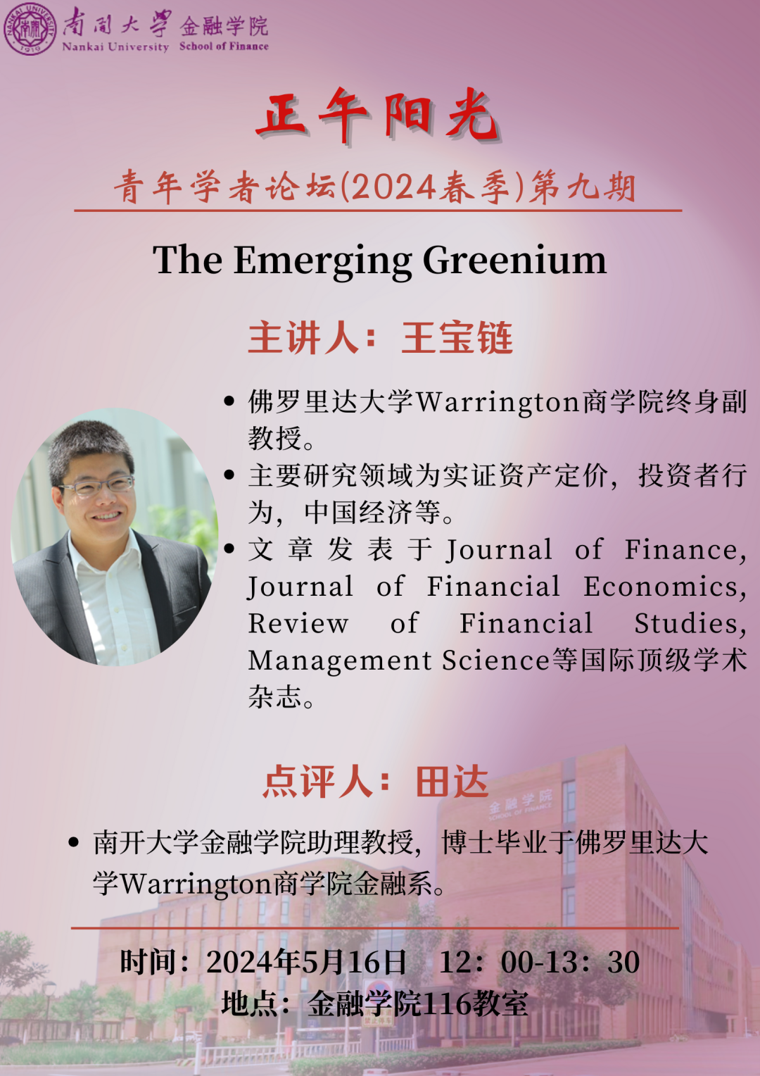 王宝链,佛罗里达大学Warrington商学院终身副教授。王宝链教授的研究领域为实证资产定价,投资者行为,中国经济等。他的文章发表于Journal of Finance, Journal of Financial Economics, Review of Financial Studies, Management Science等国际顶级学术杂志。