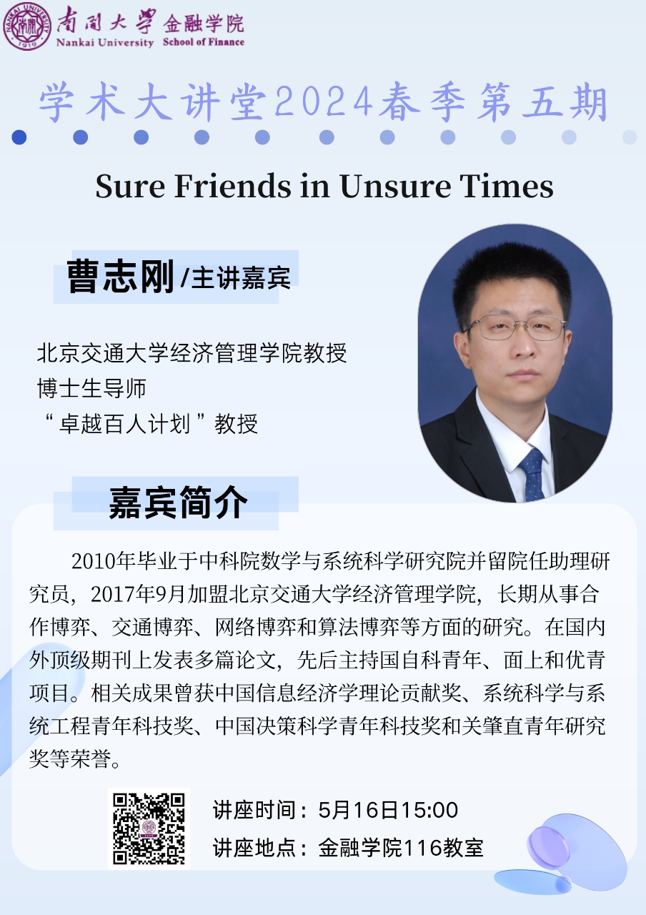 曹志刚,北京交通大学经济管理学院教授。2010年毕业于中科院数学与系统科学研究院并留院任助理研究员。2017年9月加盟北京交通大学经济管理学院,任“卓越百人计划”教授。长期从事合作博弈、交通博弈、网络博弈和算法博弈等方面的研究,在包括Operations Research、Mathematics of Operations Research、Games and Economic Behavior、Journal of Mathematical Economics、Social Choice and Welfare、International Journal of Game Theory和《中国科学:数学》在内的期刊上发表多篇论文。相关成果曾获中国信息经济学理论贡献奖、系统科学与系统工程青年科技奖、中国决策科学青年科技奖和关肇直青年研究奖等荣誉。先后主持国家自然科学基金委的青年、面上项目。兼任中国“双法”研究会智能决策与博弈分会副理事长、中国运筹学会博弈论分会副理事长、中国系统工程学会副秘书长、中国信息经济学会副秘书长、管理科学与工程学会理事和中国运筹学会理事等职务。